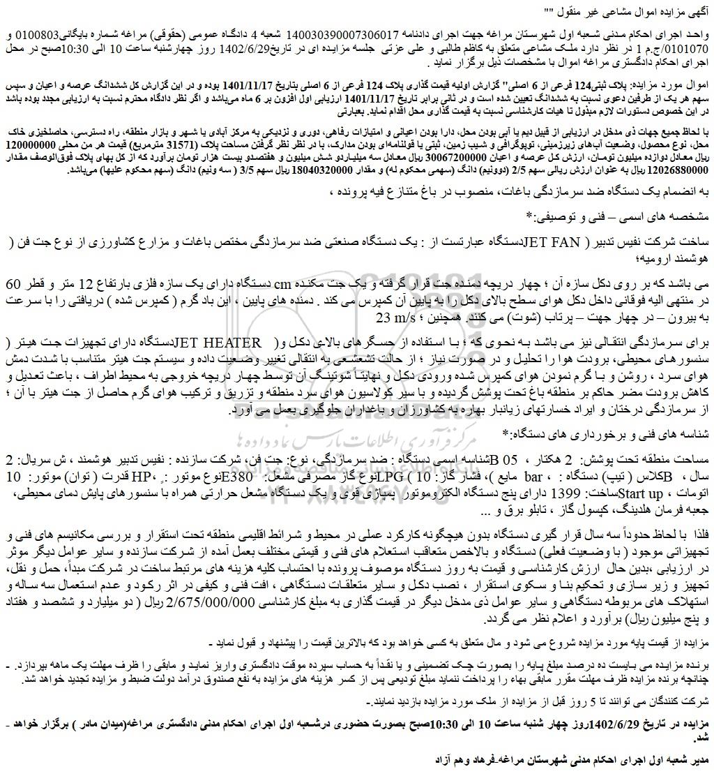 اموال مورد مزایده: پلاک ثبتی124 فرعی از 6 اصلی" گزارش اولیه قیمت گذاری پلاک 124 فرعی از 6 اصلی بتاریخ 1401/11/17 بوده و در این گزارش کل ششدانگ عرصه و اعیان و سپس سهم هر یک از طرفین دعوی نسبت به ششدانگ تعیین شده است و در ثانی برابر تاریخ 1401/11/17 ارزیابی اول افزون بر 6 ماه می باشد و اگر نظر دادگاه محترم نسبت به ارزیابی مجدد بوده باشد در این خصوص دستورات لازم مبذول تا هیات کارشناسی نسبت به قیمت گذاری محل اقدام نماید. بعبارتی