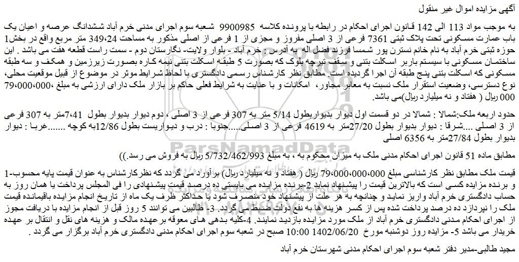 به موجب مواد 113 الی 142 قانون اجرای احکام در رابطه با پرونده کلاسه 9900985 شعبه سوم اجرای مدنی خرم آباد ششدانگ عرصه و اعیان یک باب عمارت مسکونی تحت پلاک ثبتی 7361 فرعی از 3 اصلی مفروز و مجزی از 1 فرعی از اصلی مذکور به مساحت 349،24 متر مربع واقع در بخش1 حوزه ثبتی خرم آباد به نام خانم نسترن پور شمسا فرزند فضل اله به آدرس : خرم آباد - بلوار ولایت- نگارستان دوم - سمت راست قطعه هفت می باشد . این ساختمان مسکونی با سیستم باربر اسکلت بتنی و سقف تیرچه بلوک که بصورت 5 طبقه اسکلت بتنی نیمه کاره بصورت زیرزمین و همکف و سه طبقه مسکونی که اسکلت بتنی پنج طبقه آن اجرا گردیده است. مطابق نظر کارشناس رسمی دادگستری با لحاظ شرایط موثر در موضوع از قبیل موقعیت محلی، نوع دسترسی، وضعیت استقرار ملک نسبت به معابر مجاور، امکانات و با عنایت به شرایط فعلی حاکم بر بازار ملک دارای ارزشی به مبلغ 79،000،000،000 ریال ( هفتاد و نه میلیارد ریال)می باشد.