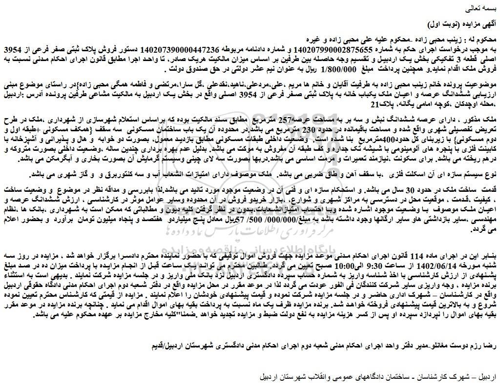 به موجب درخواست اجرای حکم به شماره 140207990002875655 و شماره دادنامه مربوطه 140207390000447236 دستور فروش پلاک ثبتی صفر فرعی از 3954 اصلی قطعه 3 تفکیکی بخش یک اردبیل و تقسیم وجه حاصله بین طرفین بر اساس میزان مالکیت هریک صادر، تا واحد اجرا مطابق قانون اجرای احکام مدنی نسبت به فروش ملک اقدام نماید.و همچنین پرداخت مبلغ 1/800/000 ریال به عنوان نیم عشر دولتی در حق صندوق دولت .