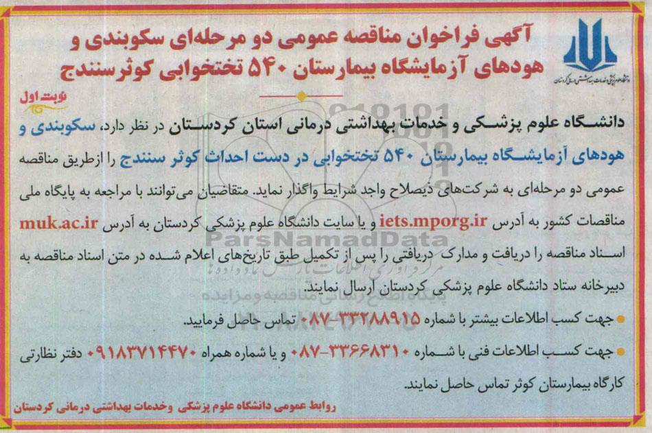 دانشگاه علوم پزشکی و خدمات بهداشتی درمانی استان کردستان در نظردارد سکوبندی و هودهای آزمایشگاه بیمارستان 540 تختخوابی کوثر سنندج را از طریق مناقصه عمومی به شرکت های ذیصلاح واجد شرایط واگذار نماید. متقاضیان می توانند با مراجعه به پایگاه ملی مناقصات کشور به آدرس iets.mporg.ir ویا سایت دانشگاه علوم پزشکی کردستان به آدرس muk.ac.ir اسناد مناقصه را دریافت و مدارک دریافتی را پس از تکمیل طبق تاریخ های اعلام شده در متن اسناد مناقصه به دبیرخانه ستاد ستاد دانشگاه علوم پزشکی کردستان ارسال نمایند.