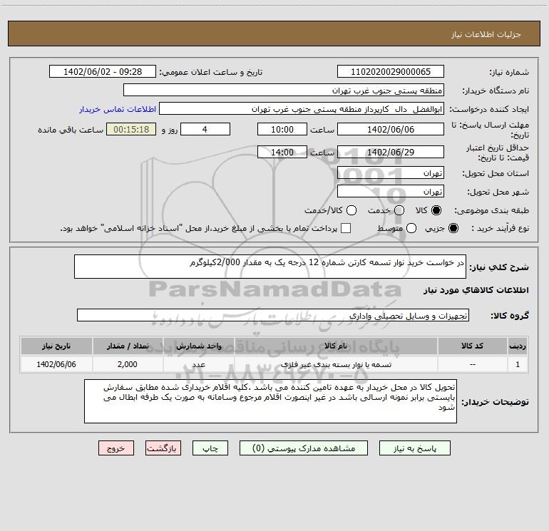 شرح کلی نیاز: در خواست خرید نوار تسمه کارتن شماره 12 درجه یک به مقدار 2/000کیلوگرم