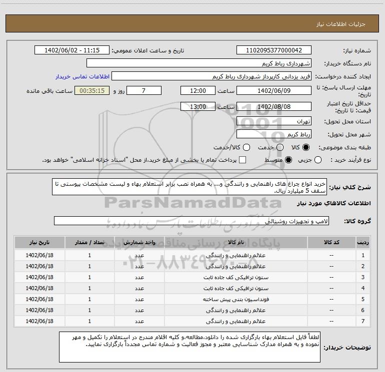 شرح کلی نیاز: خرید انواع چراغ های راهنمایی و رانندگی و... به همراه نصب برابر استعلام بهاء و لیست مشخصات پیوستی تا سقف 5 میلیارد ریال.