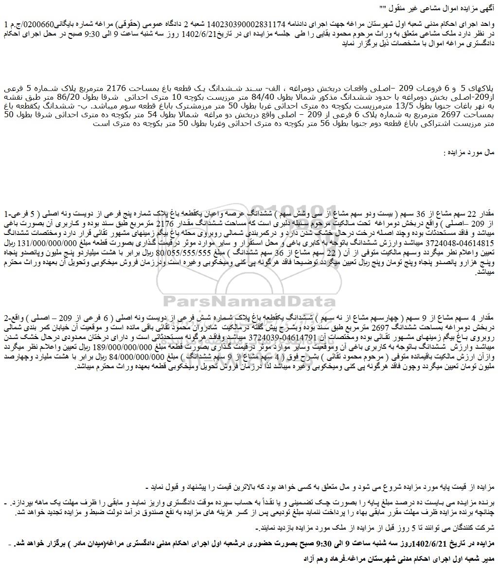 واحد اجرای احکام مدنی شعبه اول شهرستان مراغه جهت اجرای دادنامه 140230390002831174 شعبه 2 دادگاه عمومی (حقوقی) مراغه شماره بایگانی0200660/ج.م 1 در نظر دارد ملک مشاعی متعلق به وراث مرحوم محمود بقایی را طی جلسه مزایده ای در تاریخ1402/6/21 روز سه شنبه ساعت 9 الی 9:30 صبح در محل اجرای احکام دادگستری مراغه اموال با مشخصات ذیل برگزار نماید
