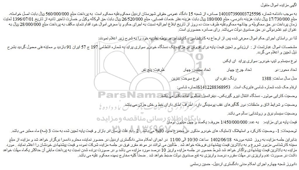 مشخصات اموال عبارتست از : ارزیابی و تعیین قیمت پایه برای فروش در مزایده یک دستگاه خودرو سواری پراید به شماره انتظامی 197 ج 57 ایران 91 بازدید و معاینه فنی معمول گردید بشرح ذیل تعیین و اعلام می گردد.