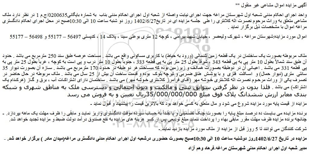 واحد اجرای احکام مدنی شعبه اول شهرستان مراغه جهت اجرای نیابت واصله از شعبه اول اجرای احکام مدنی بناب  به شماره بایگانی0200635/ج.م 1 در نظر دارد ملک مشاعی متعلق به وراث مرحوم نصرت اله کلانتری را طی  جلسه مزایده ای در تاریخ1402/6/27 روز دو شنبه ساعت 10 الی 10:30صبح در محل اجرای احکام دادگستری مراغه اموال با مشخصات ذیل برگزار نماید .