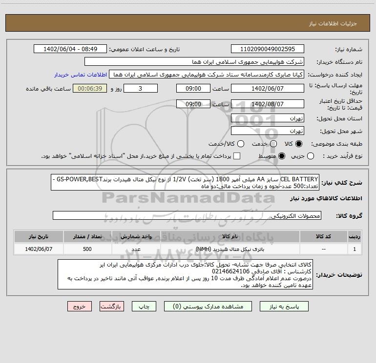 | 1 | -- | باتری نیکل متال هیدرید (NiMH) | عدد | 500 | 1402/06/07 |