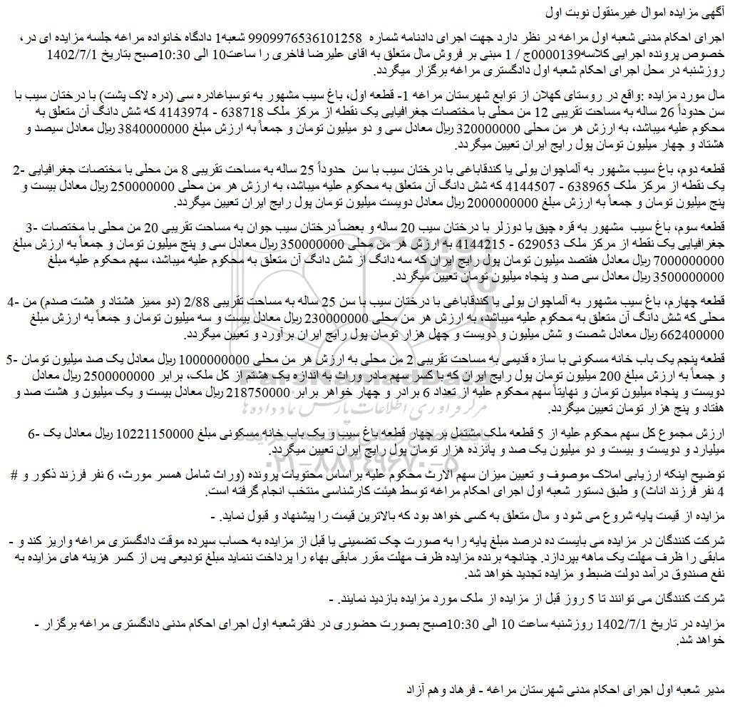 - مزایده در تاریخ 1402/7/1 روزشنبه ساعت 10 الی 10:30صبح بصورت حضوری در دفترشعبه اول اجرای احکام مدنی دادگستری مراغه برگزار خواهد شد.