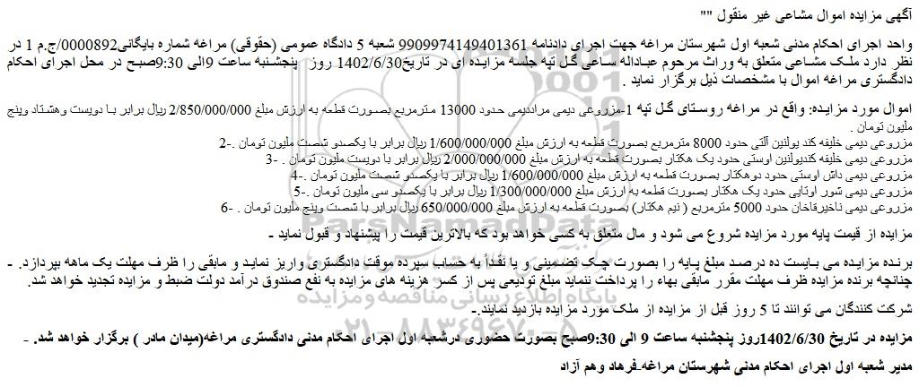 واحد اجرای احکام مدنی شعبه اول شهرستان مراغه جهت اجرای دادنامه 9909974149401361 شعبه 5 دادگاه عمومی (حقوقی) مراغه شماره بایگانی0000892/ج.م 1 در نظر دارد ملک مشاعی متعلق به وراث مرحوم عباداله ساعی گل تپه جلسه مزایده ای در تاریخ1402/6/30 روز پنجشنبه ساعت 9الی 9:30صبح در محل اجرای احکام دادگستری مراغه اموال با مشخصات ذیل برگزار نماید .