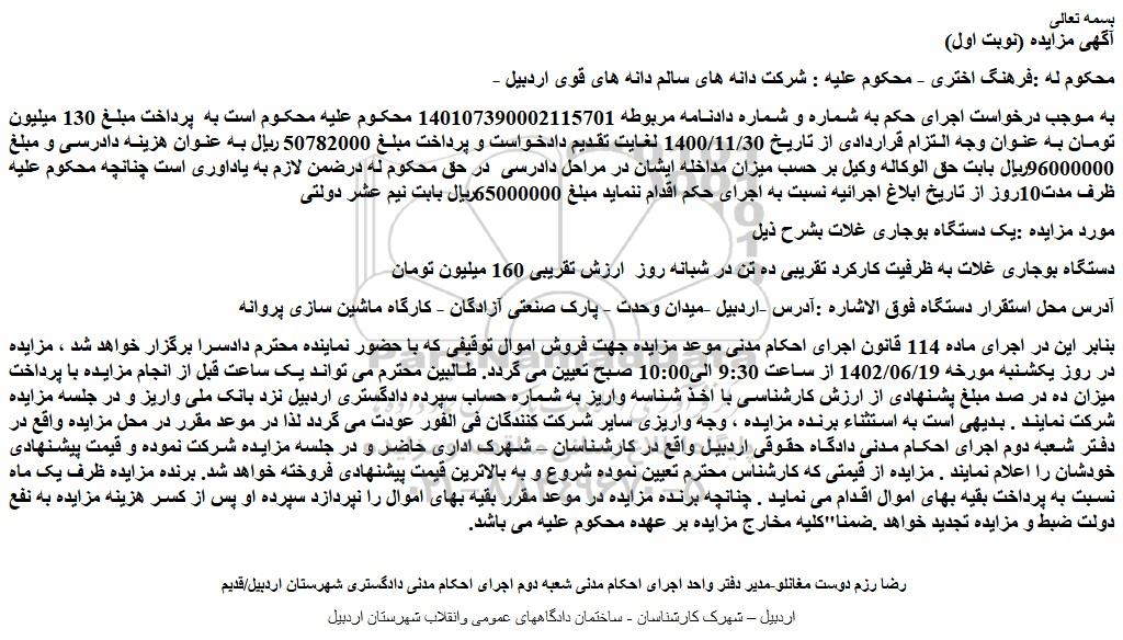 بنابر این در اجرای ماده 114 قانون اجرای احکام مدنی موعد مزایده جهت فروش اموال توقیفی که با حضور نماینده محترم دادسرا برگزار خواهد شد ، مزایده در روز یکشنبه مورخه 1402/06/19 از ساعت 9:30 الی10:00 صبح تعیین می گردد. طالبین محترم می تواند یک ساعت قبل از انجام مزایده با پرداخت میزان ده در صد مبلغ پشنهادی از ارزش کارشناسی با اخذ شناسه واریز به شماره حساب سپرده دادگستری اردبیل نزد بانک ملی واریز و در جلسه مزایده شرکت نمایند . بدیهی است به استثناء برنده مزایده ، وجه واریزی سایر شرکت کنندگان فی الفور عودت می گردد لذا در موعد مقرر در محل مزایده واقع در دفتر شعبه دوم اجرای احکام مدنی دادگاه حقوقی اردبیل واقع در کارشناسان – شهرک اداری حاضر و در جلسه مزایده شرکت نموده و قیمت پیشنهادی خودشان را اعلام نمایند . مزایده از قیمتی که کارشناس محترم تعیین نموده شروع و به بالاترین قیمت پیشنهادی فروخته خواهد شد. برنده مزایده ظرف یک ماه نسبت به پرداخت بقیه بهای اموال اقدام می نماید . چنانچه برنده مزایده در موعد مقرر بقیه بهای اموال را نپردازد سپرده او پس از کسر هزینه مزایده به نفع دولت ضبط و مزایده تجدید خواهد .ضمنا"کلیه مخارج مزایده بر عهده محکوم علیه می باشد.