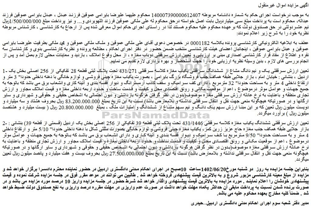 بنابراین جلسه مزایده به روز دو شنبه مورخ1402/06/20ساعت 10صبح در اجرای احکام مدنی دادگستری اردبیل در حضور نماینده محترم دادسرا برگزار خواهد شد و مزایده از مبلغ معینه کارشناسی مزبور شروع و به بالاترین قیمت پیشنهادی فروخته خواهد شد . طالبین می توانند در موعد مقرر فوق در جلسه مزایده شرکت نموده و قیمت پیشنهادی خودشان را اعلام نمایند . مورد مزایده به بالاترین قیمت پیشنهادی واگذار خواهد شد شرط حضور در جلسه مزایده واریز 10 درصد مورد مزایده می باشد و در صورت برنده شدن نسبت به پرداخت مابقی آن حداکثر یکماه مهلت خواهد داشت در صورت عدم واریزی در مهلت مقرره درصد واریزی به نفع صندوق دولت ضبط خواهد شد . ضمناً کلیه مخارج بعهده محکوم علیه می باشد