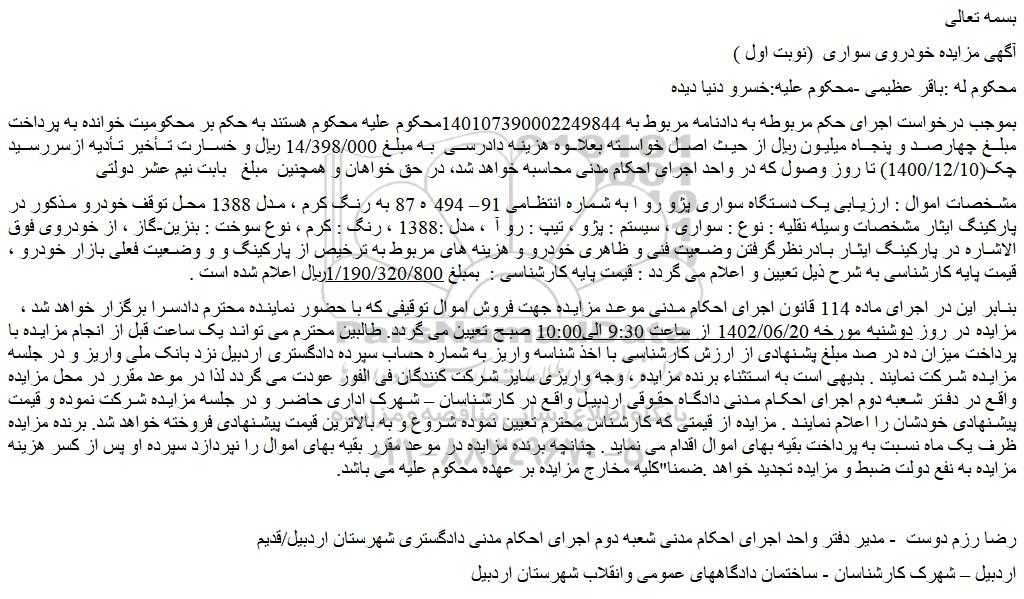 بنابر این در اجرای ماده 114 قانون اجرای احکام مدنی موعد مزایده جهت فروش اموال توقیفی که با حضور نماینده محترم دادسرا برگزار خواهد شد ، مزایده در روز دوشنبه مورخه 1402/06/20 از ساعت 9:30 الی10:00 صبح تعیین می گردد. طالبین محترم می تواند یک ساعت قبل از انجام مزایده با پرداخت میزان ده در صد مبلغ پشنهادی از ارزش کارشناسی با اخذ شناسه واریز به شماره حساب سپرده دادگستری اردبیل نزد بانک ملی واریز و در جلسه مزایده شرکت نمایند . بدیهی است به استثناء برنده مزایده ، وجه واریزی سایر شرکت کنندگان فی الفور عودت می گردد لذا در موعد مقرر در محل مزایده واقع در دفتر شعبه دوم اجرای احکام مدنی دادگاه حقوقی اردبیل واقع در کارشناسان – شهرک اداری حاضر و در جلسه مزایده شرکت نموده و قیمت پیشنهادی خودشان را اعلام نمایند . مزایده از قیمتی که کارشناس محترم تعیین نموده شروع و به بالاترین قیمت پیشنهادی فروخته خواهد شد. برنده مزایده ظرف یک ماه نسبت به پرداخت بقیه بهای اموال اقدام می نماید . چنانچه برنده مزایده در موعد مقرر بقیه بهای اموال را نپردازد سپرده او پس از کسر هزینه مزایده به نفع دولت ضبط و مزایده تجدید خواهد .ضمنا"کلیه مخارج مزایده بر عهده محکوم علیه می باشد.