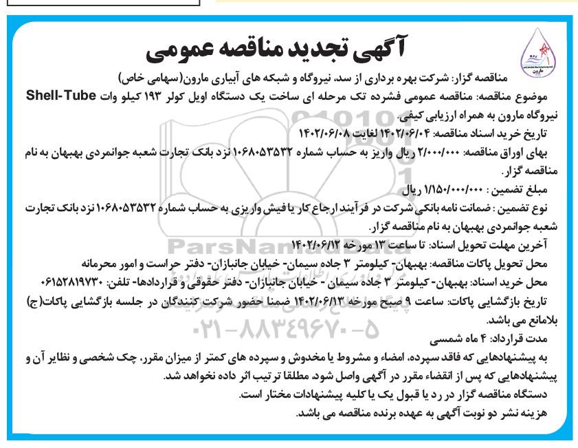 موضوع مناقصه: مناقصه عمومی فشرده تک مرحله ای ساخت یک دستگاه اویل کولر 193 کیلووات Shell-Tube نیروگاه مارون به همراه ارزیابی کیفی