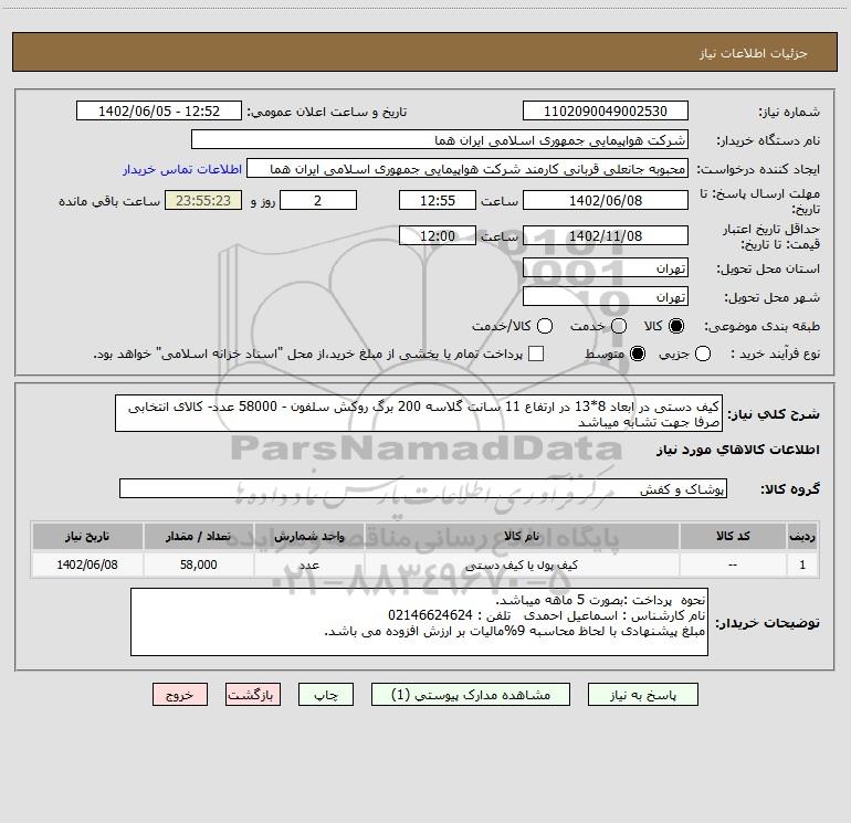 شرح کلی نیاز: کیف دستی در ابعاد 8*13 در ارتفاع 11 سانت گلاسه 200 برگ روکش سلفون - 58000 عدد- کالای انتخابی صرفا جهت تشابه میباشد