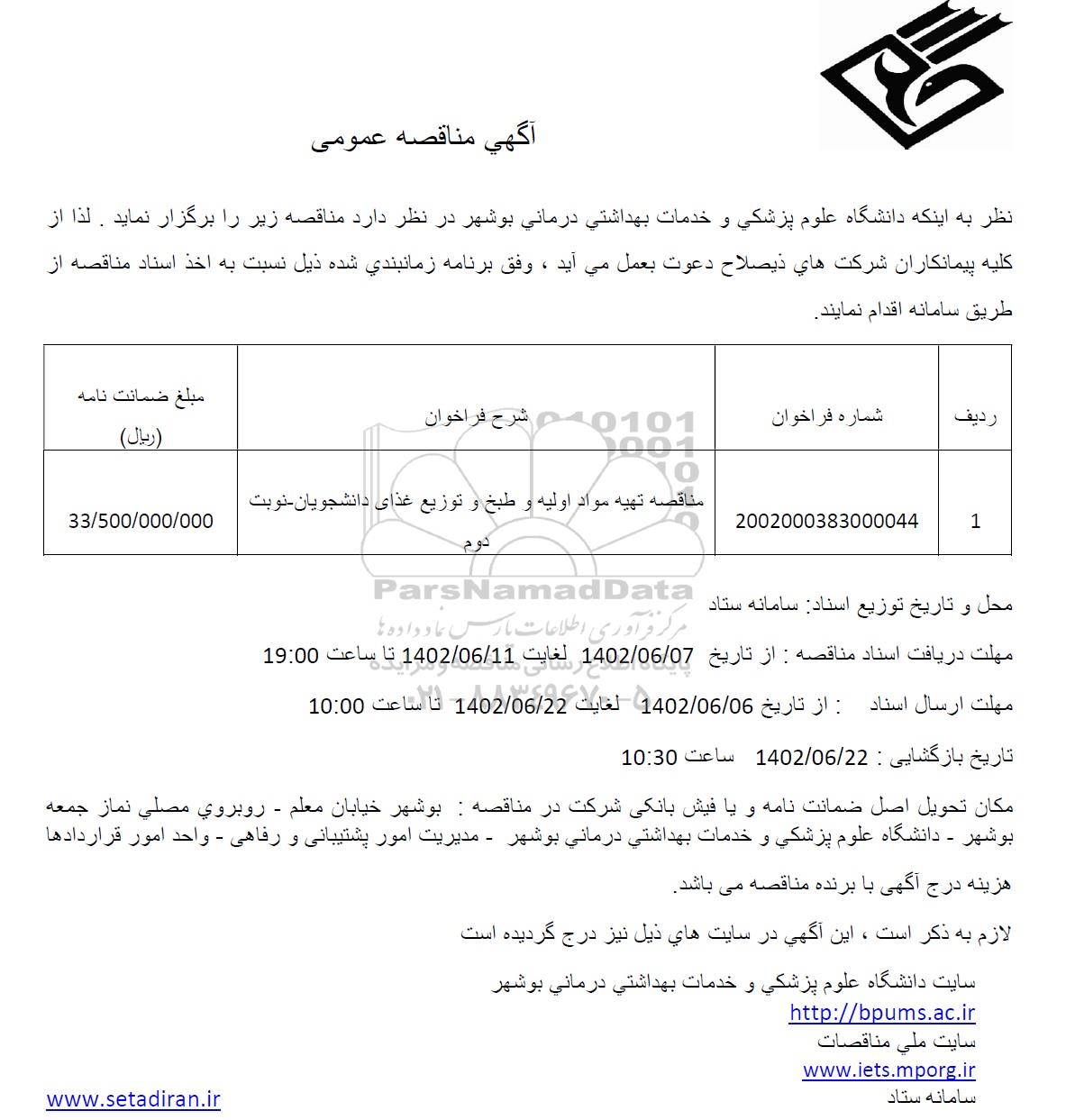 نظر به اینكه دانشگاه علوم پزشكی و خدمات بهداشتی درمانی بوشهر در نظر دارد مناقصه زیر را برگزار نماید. لذا از کلیه پیمانکاران شرکت های ذیصلاح دعوت به عمل می آید ، وفق برنامه زمان بندی شده ذیل نسبت به اخذ اسناد مناقصه از طریق سامانه اقدام نمایند.