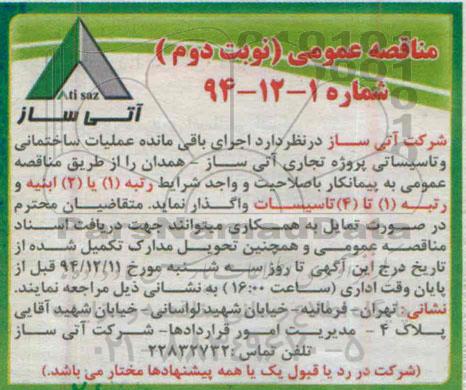 شرکت آتی ساز در نظر دارد اجرای باقی مانده عملیات ساختمانی و تاسیساتی پروژه تجاری آتی ساز - همدان را از طریق مناقصه عمومی به پیمانکار با صلاحیت و واجد شرایط رتبه یک یا دو ابنیه و رتبه 1 تا 4 تاسیسات واگذار نماید.