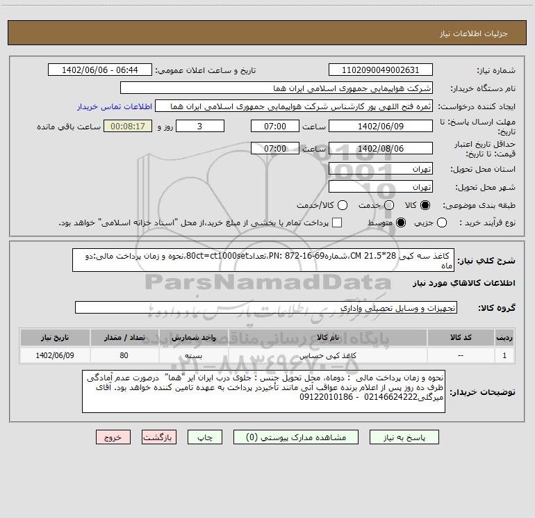 شرح کلی نیاز: کاغذ سه کپی 28*21.5 CM،شمارهPN: 872-16-69،تعداد80ct=ct1000set،نحوه و زمان پرداخت مالی:دو ماه