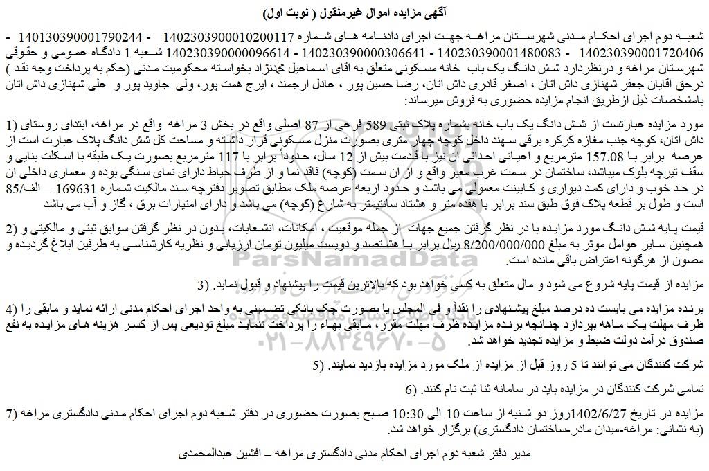شعبه دوم اجرای احکام مدنی شهرستان مراغه جهت اجرای دادنامه های شماره 1402303900010200117 - 140130390001790244 - 140230390001720406 - 140230390001480083- 140230390000306641- 140230390000096614 شعبه 1 دادگاه عمومی و حقوقی شهرستان مراغه و درنظردارد شش دانگ یک باب  خانه مسکونی متعلق به آقای اسماعیل محمدنژاد بخواسته محکومیت مدنی (حکم به پرداخت وجه نقد ) درحق آقایان جعفر شهنازی داش اتان ، اصغر قادری داش آتان، رضا حسین پور ، عادل ارجمند ، ایرج همت پور، ولی  جاوید پور و  علی شهنازی داش اتان بامشخصات ذیل ازطریق انجام مزایده حضوری به فروش میرساند: