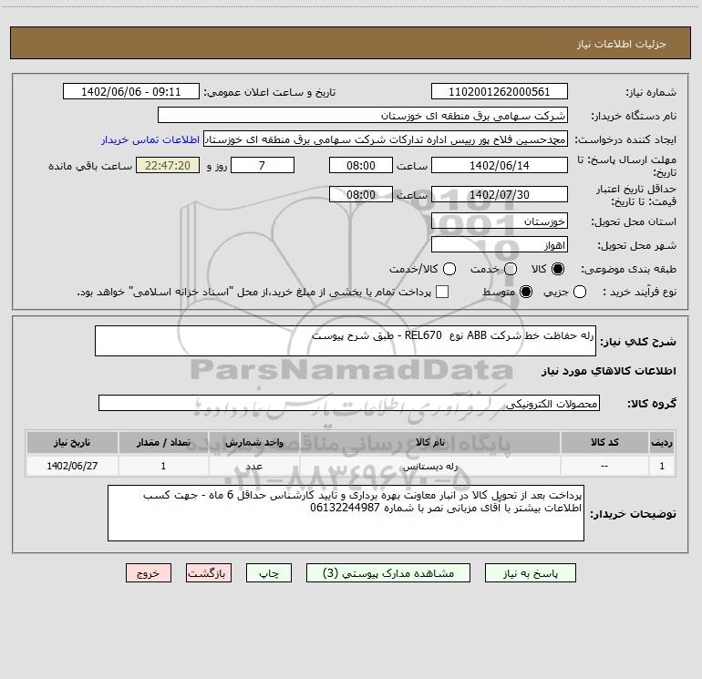 شرح کلی نیاز: رله حفاظت خط شرکت ABB نوع REL670 - طبق شرح پیوست