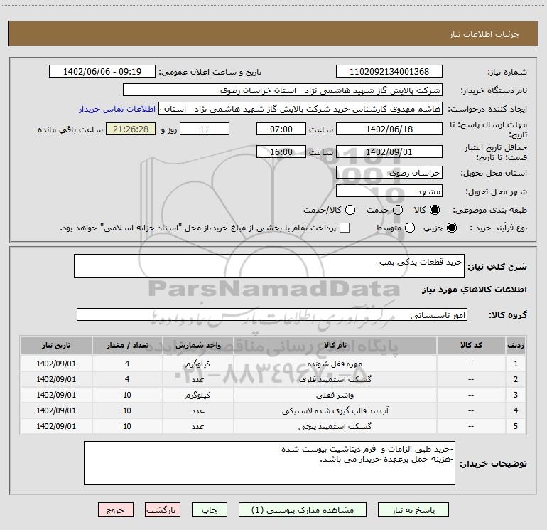 نام دستگاه خریدار:شرکت پالایش گاز شهید هاشمی نژاد استان خراسان رضوی