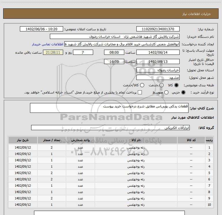 نام دستگاه خریدار:شرکت پالایش گاز شهید هاشمی نژاد استان خراسان رضوی
