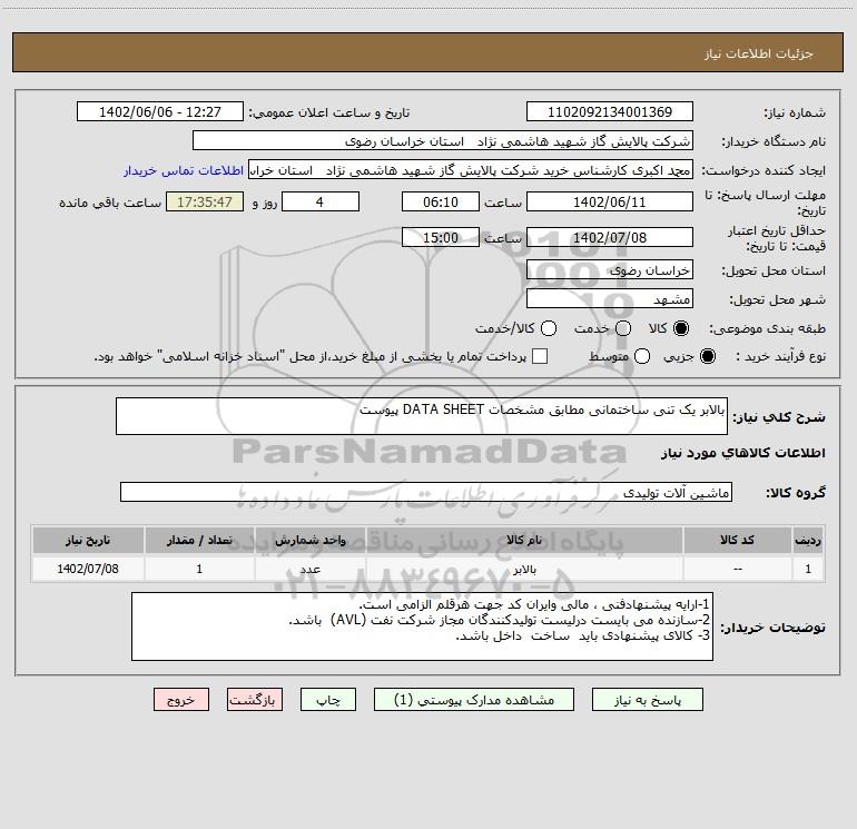 شرح کلی نیاز: بالابر یک تنی ساختمانی مطابق مشخصات DATA SHEET پیوست