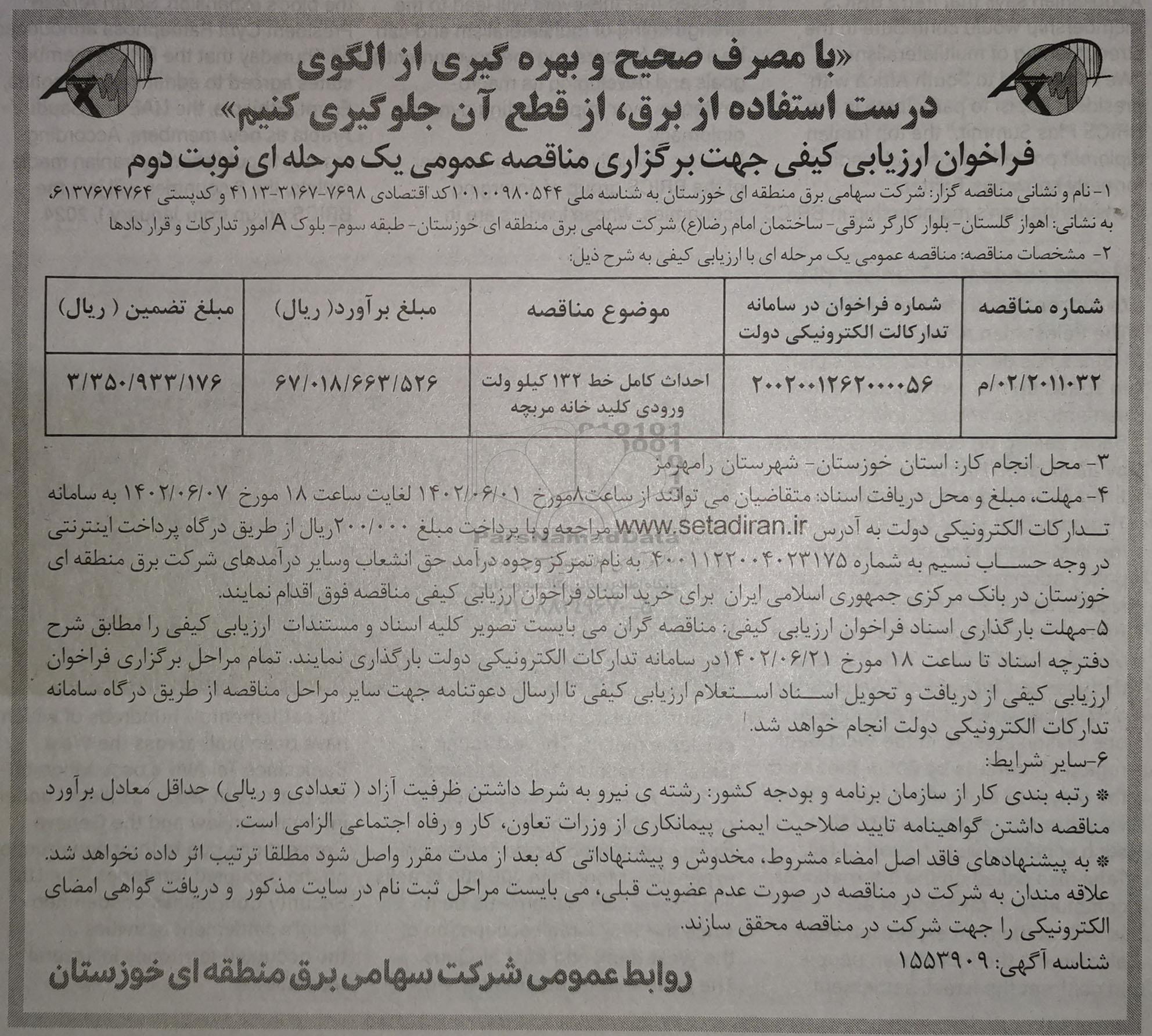 1- نام و نشانی مناقصه گزار : شرکت سهامی برق منطقه ای خوزستان به شناسه ملی 10100980544 کد اقتصادی 7698-3167-4113 و کد پستی 6137674764 به نشانی اهواز - گلستان - بلوار کارگر شرقی ساختمان 8 طبقه شرکت سهامی برق منطقه ای خوزستان طبقه سوم بلوک A امور تدارکات و قراردادها