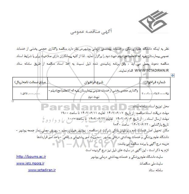 نظر به اینكه دانشگاه علوم پزشكی و خدمات بهداشتی درمانی بوشهر در نظر دارد مناقصه واگذاری حجمی بخشی از خدمات عمومی بیمارستان بقیه اله الاعظم (عج) دیلم - نوبت دوم را برگزار نماید. لذا از کلیه پیمانکاران دارای صلاحیت برابر با شرایط اسناد مناقصه دعوت به عمل می آید وفق برنامه زمانبندی شده ذیل نسبت به اخذ اسناد مناقصه از طریق سامانه ستاد اقدام نماید.