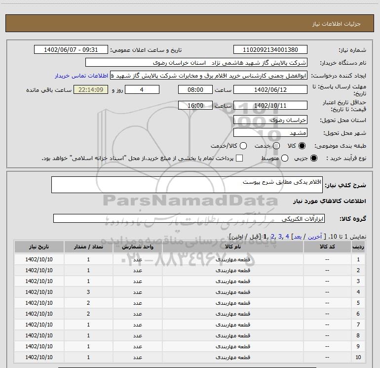 شرح کلی نیاز: اقلام یدکی مطابق شرح پیوست
