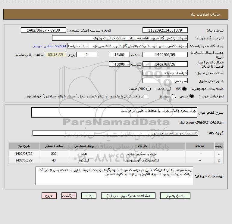 نام دستگاه خریدار:شرکت پالایش گاز شهید هاشمی نژاد استان خراسان رضوی
