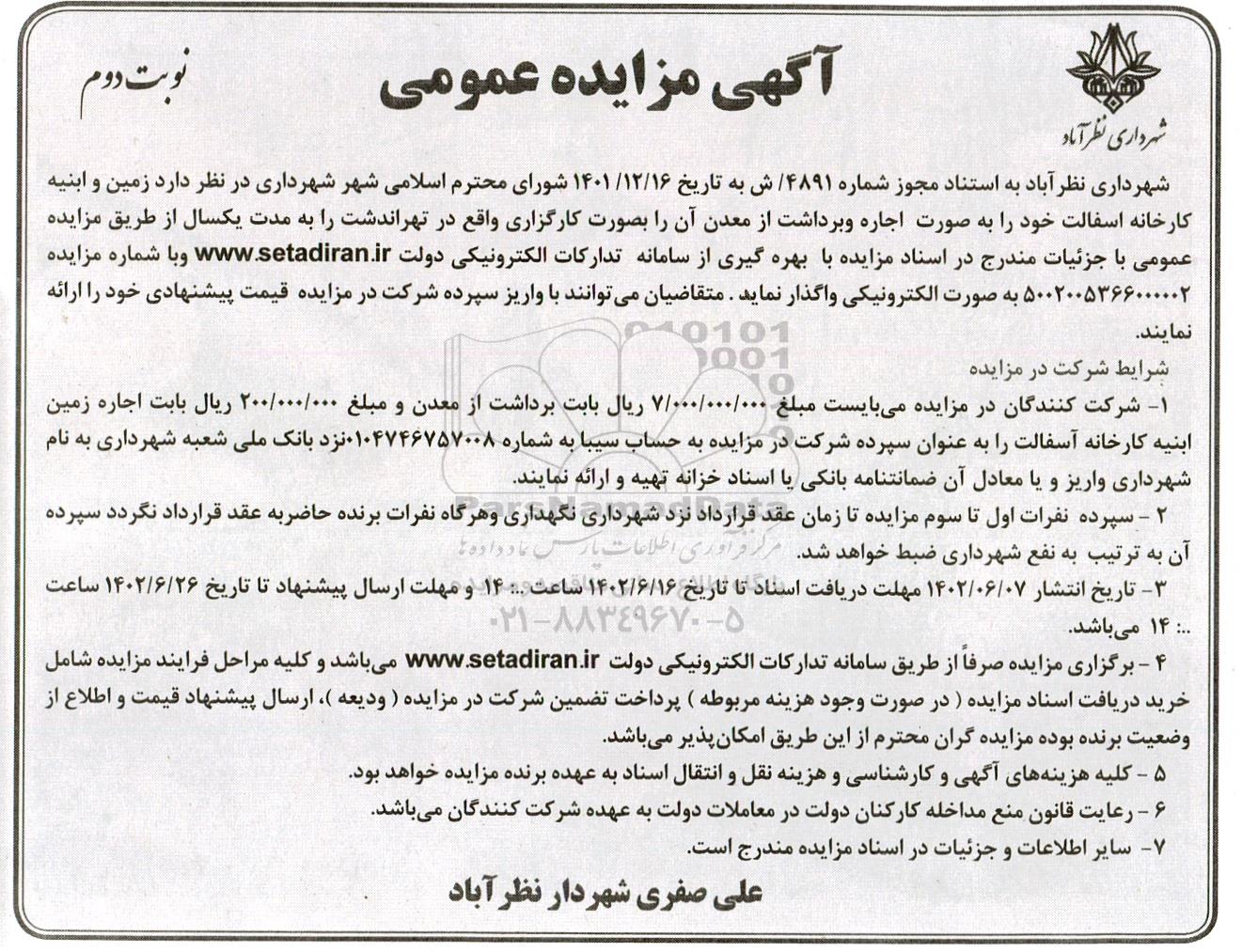 شهرداری نظر آباد به استناد مجوز شماره ۴۸۹۱ ش به تاریخ ۱۴۰۱/۱۲/۱۶ شورای محترم اسلامی شهر شهرداری در نظر دارد زمین و ابنیه کارخانه آسفالت خود را به صورت اجاره و برداشت از معدن آن را بصورت کارگزاری واقع در تهراندشت را به مدت یکسال از طریق مزایده عمومی با جزئیات مندرج در اسناد مزایده با بهره گیری از سامانه تدارکات الکترونیکی دولت ستاد ایران و با شماره مزایده 5002005366000002 به صورت الکترونیکی واگذار نماید. متقاضیان میتوانند با واریز سپرده شرکت در مزایده قیمت پیشنهادی خود را ارائه نمایند .