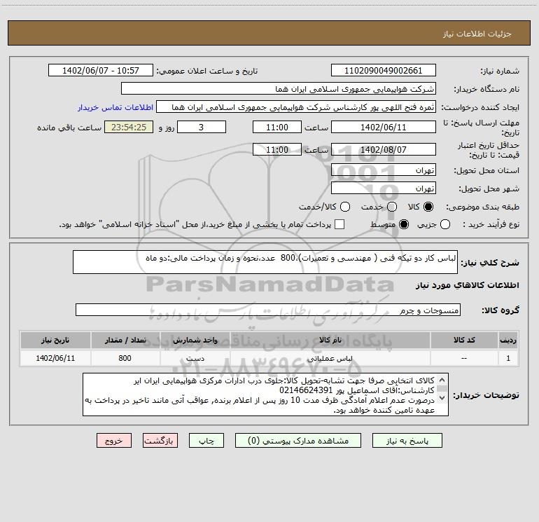 شرح کلی نیاز: لباس کار دو تیکه فنی ( مهندسی و تعمیرات)،800 عدد،نحوه و زمان پرداخت مالی:دو ماه