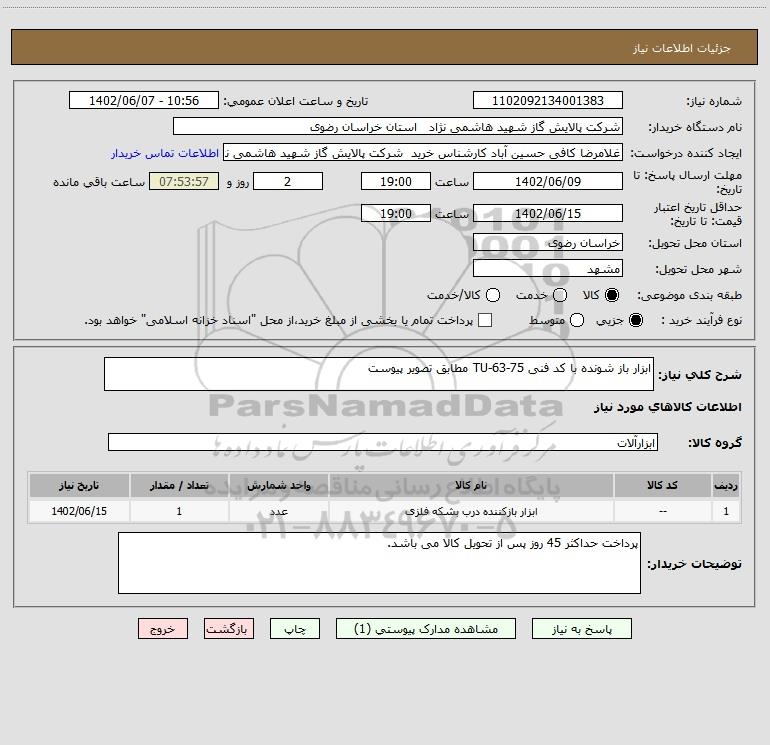 شرح کلی نیاز: ابزار باز شونده با کد فنی TU-63-75 مطابق تصویر پیوست