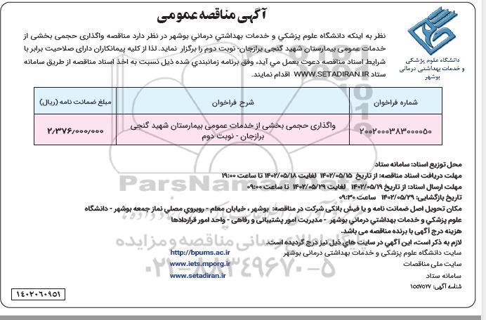 2002000383000050 واگذاری حجمی بخشی از خدمات عمومی بیمارستان شهید گنجی برازجان - نوبت دوم  2.376.000.000