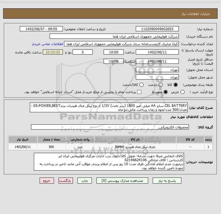 شرح کلی نیاز: CEL BATTERY سایز AA میلی آمپر 1800 (سر تخت) 1/2V از نوع نیکل متال هیدرات برندGS-POWER,BEST - تعداد:500 عدد-نحوه و زمان پرداخت مالی:دو ماه