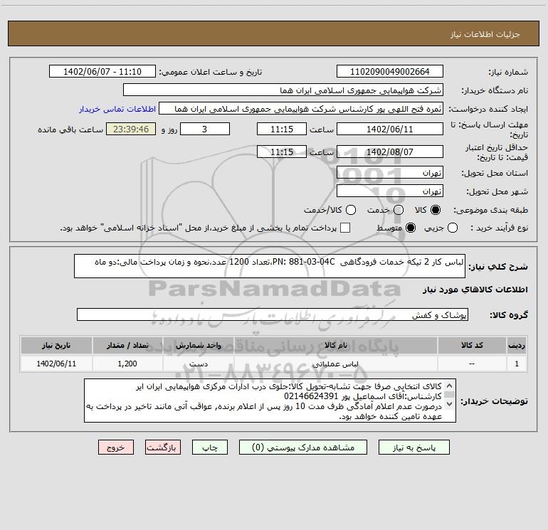 شرح کلی نیاز: لباس کار 2 تیکه خدمات فرودگاهی PN: 881-03-04C،تعداد 1200 عدد،نحوه و زمان پرداخت مالی:دو ماه