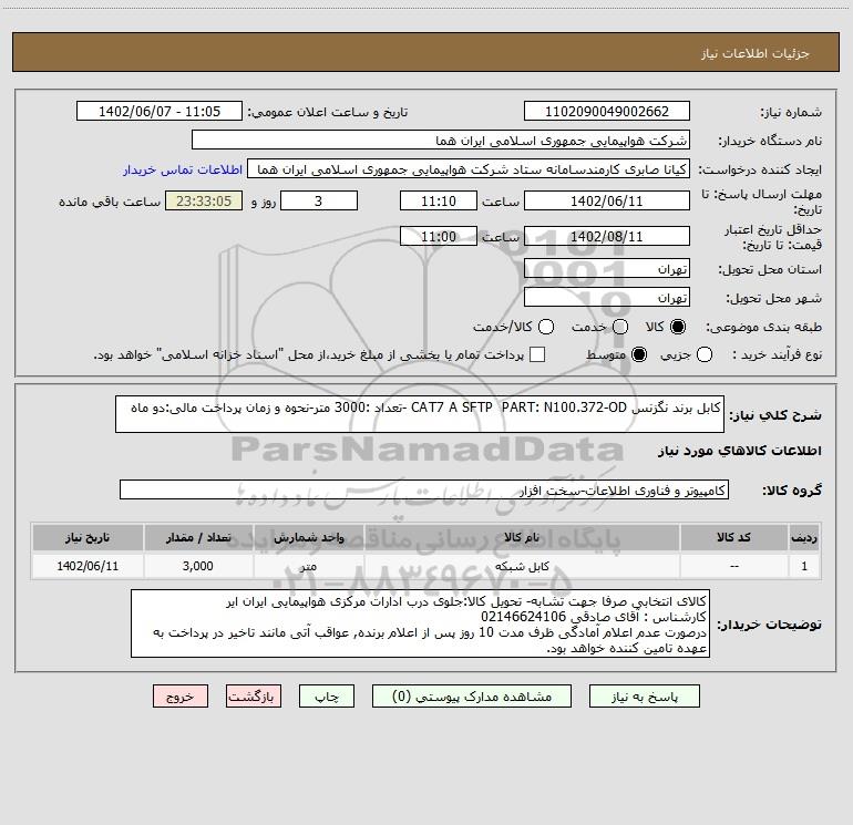 شرح کلی نیاز: کابل برند نگزنس CAT7 A SFTP PART: N100.372-OD -تعداد :3000 متر-نحوه و زمان پرداخت مالی:دو ماه