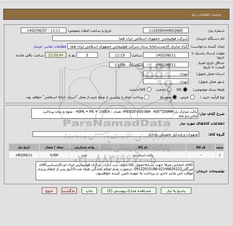 استعلام پاکت مدارک بار PN:920-005-064 400*330MM- تعداد : 40PK = PK = 100EA - نحوه و زمان پرداخت مالی:دو ماه, استعلام پاکت مدارک بار PN:920-005-064 400*330MM- تعداد : 40PK = PK = 100EA - نحوه و زمان پرداخت مالی:دو ماه