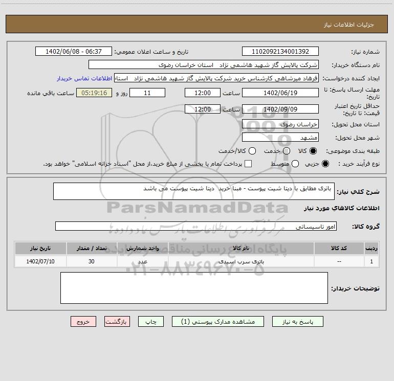 نام دستگاه خریدار:شرکت پالایش گاز شهید هاشمی نژاد استان خراسان رضوی