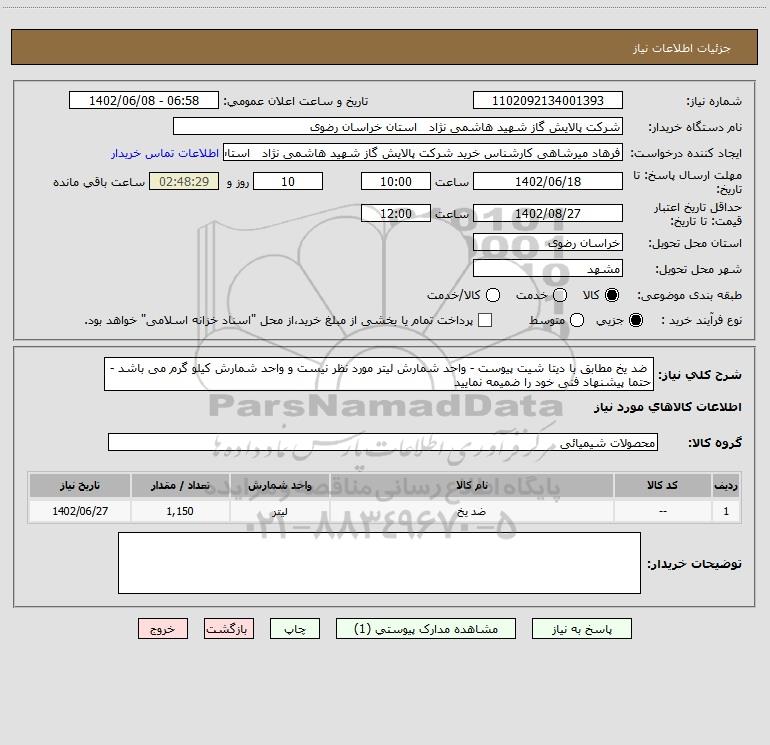 نام دستگاه خریدار:شرکت پالایش گاز شهید هاشمی نژاد استان خراسان رضوی