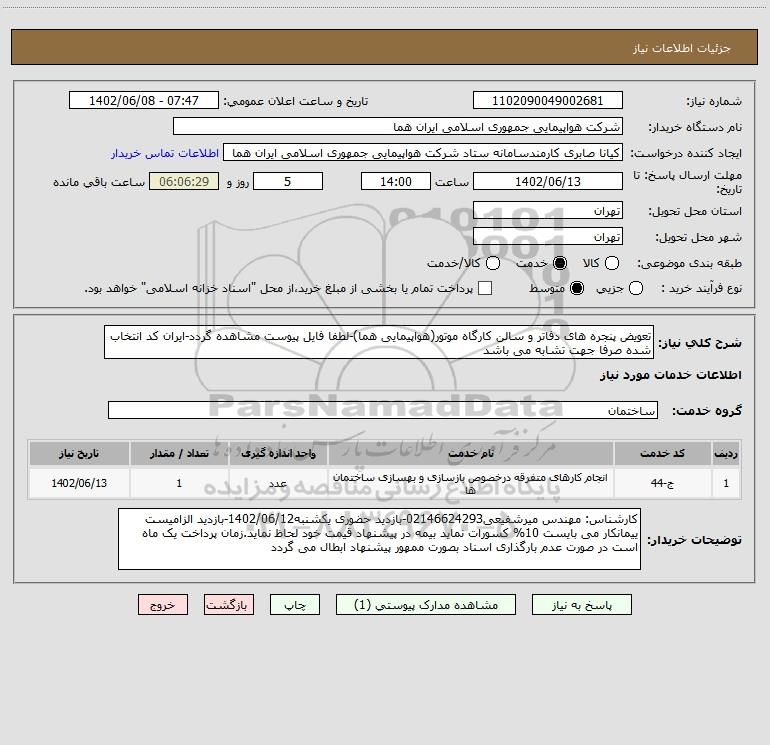 شرح کلی نیاز: تعویض پنجره های دفاتر و سالن کارگاه موتور(هواپیمایی هما)-لطفا فایل پیوست مشاهده گردد-ایران کد انتخاب شده صرفا جهت تشابه می باشد