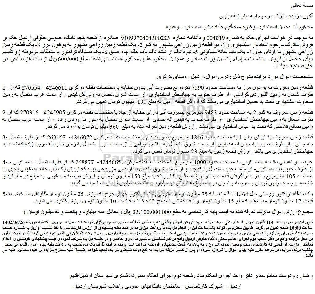 به موجب در خواست اجرای حکم به شماره 004019 و دادنامه شماره 9109970404500225 صادره از شعبه پنجم دادگاه عمومی حقوقی اردبیل حکم بر فروش ماترک مرحوم اسفندیار اسفندیاری ( 1- دو قطعه زمین زراعی مشهور به کدو 2- یک قطعه زمین زراعی مشهور به یوغون مرز 3- یک قطعه زمین زراعی مشهور به اوتای چای 4- یک باب خانه مسکونی 5- نیم دانگ از ششدانگ یک حلقه چاه عمیق 6- یک دستگاه تراکتور با متعلقات مربوطه ) و تقسیم بهای حاصل از فروش به نسبت سهم الارث بین وراث صادر و همچنین محکوم علیهم محکوم هستند به پرداخت مبلغ 600/000 ریال از بابت هزینه اجرا در حق صندوق دولت .