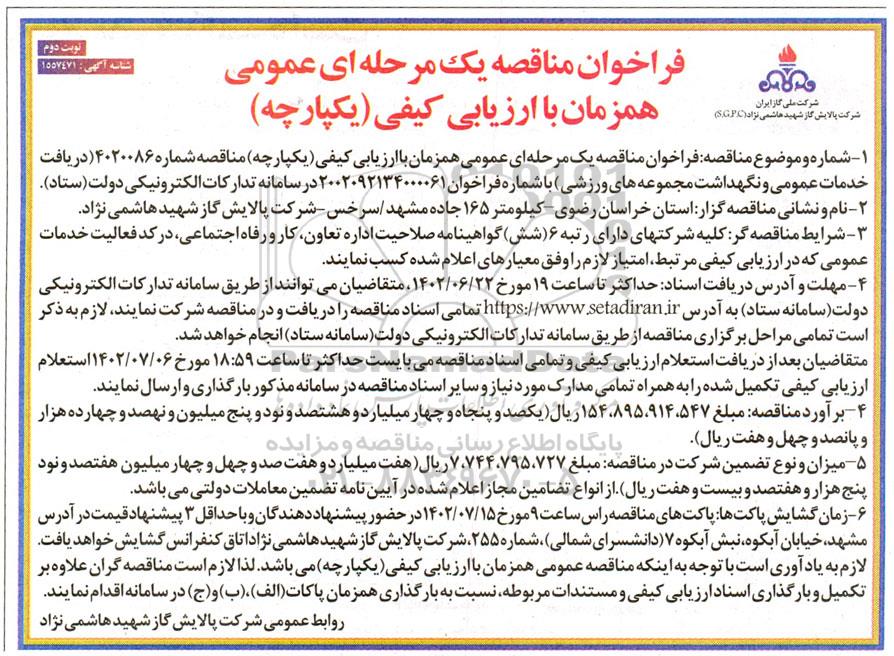 1. شماره موضوع مناقصه: فراخوان مناقصه یک مرحله ای عمومی همزمان با ارزیابی کیفی (یکپارچه) مناقصه شماره 4020086 ( دریافت خدمات عمومی و نگهداشت مجموعه های ورزشی ) با شماره فراخوان 2002092134000061 در سامانه تدارکات الکترونیکی دولت ستاد