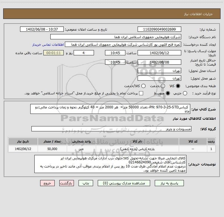 شرح کلی نیاز: کرباسPN: 970-3-25-STD-،تعداد 50000 متر= هر 2000 متر = 40 کیلوگرم ،نحوه و زمان پرداخت مالی:دو ماه