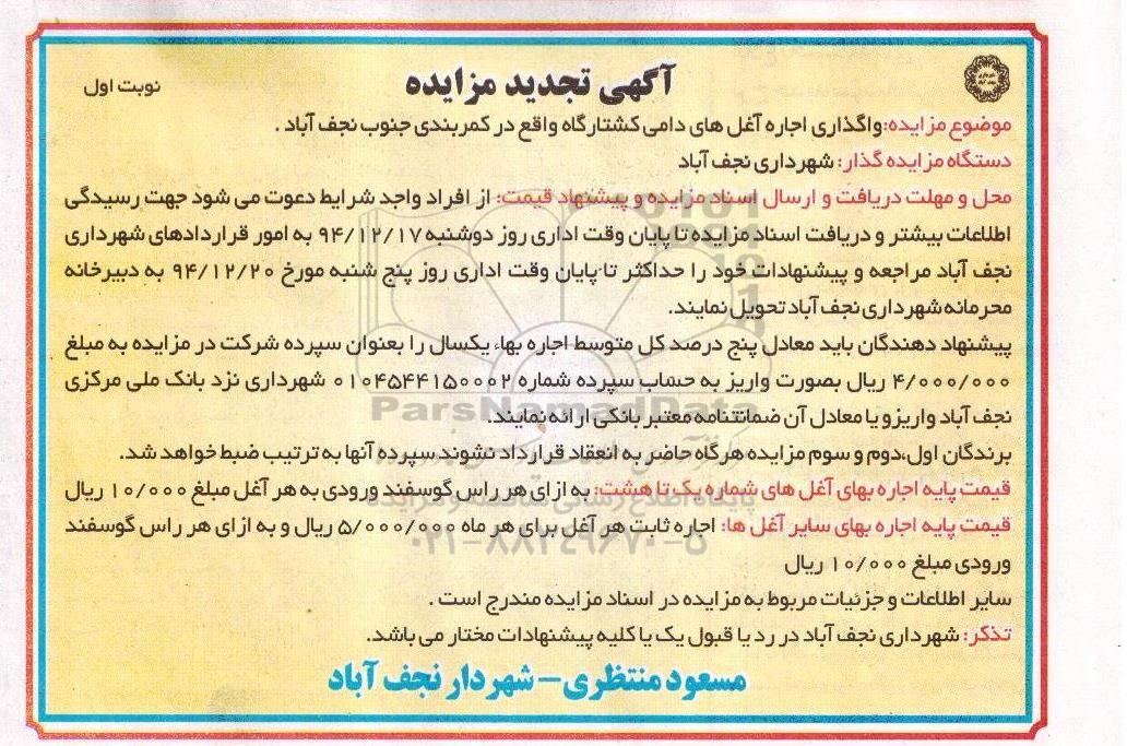 مزایده عمومی تجدید مزایده واگذاری اجاره آغل های دامی کشتارگاه تجدید برگزار میگردد. از کلیه افراد متخصص و شرکت‌های واجد شرایط دعوت به عمل می‌آید تا در این مزایده با کد خبرگزاری پارس نماد : 629377 شرکت نمایند تاریخ شروع مزایده : 1394/12/03 مهلت شرکت در مزایده: تا پایان روز 1394/12/17 مکان برگزاری اموال واگذاری استان‌های اصفهان و دسته‌بندی‌های مربوط به این حراجی واگذاری ورزشگاه، پارکینگ، غرفه و بوفه میباشد.