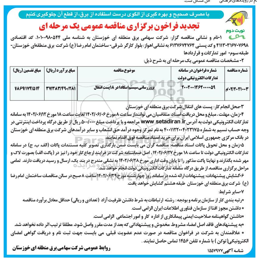 تجدید مناقصه عمومی بروزرسانی سیستم اسکادا در 18 پست انتقال - نوبت دوم از کلیه افراد متخصص و شرکتها واجد شرایط دعوت به عمل میآید در مناقصه با کد خبرگزاری پارس نماد: 6293948 شرکت نمایند.