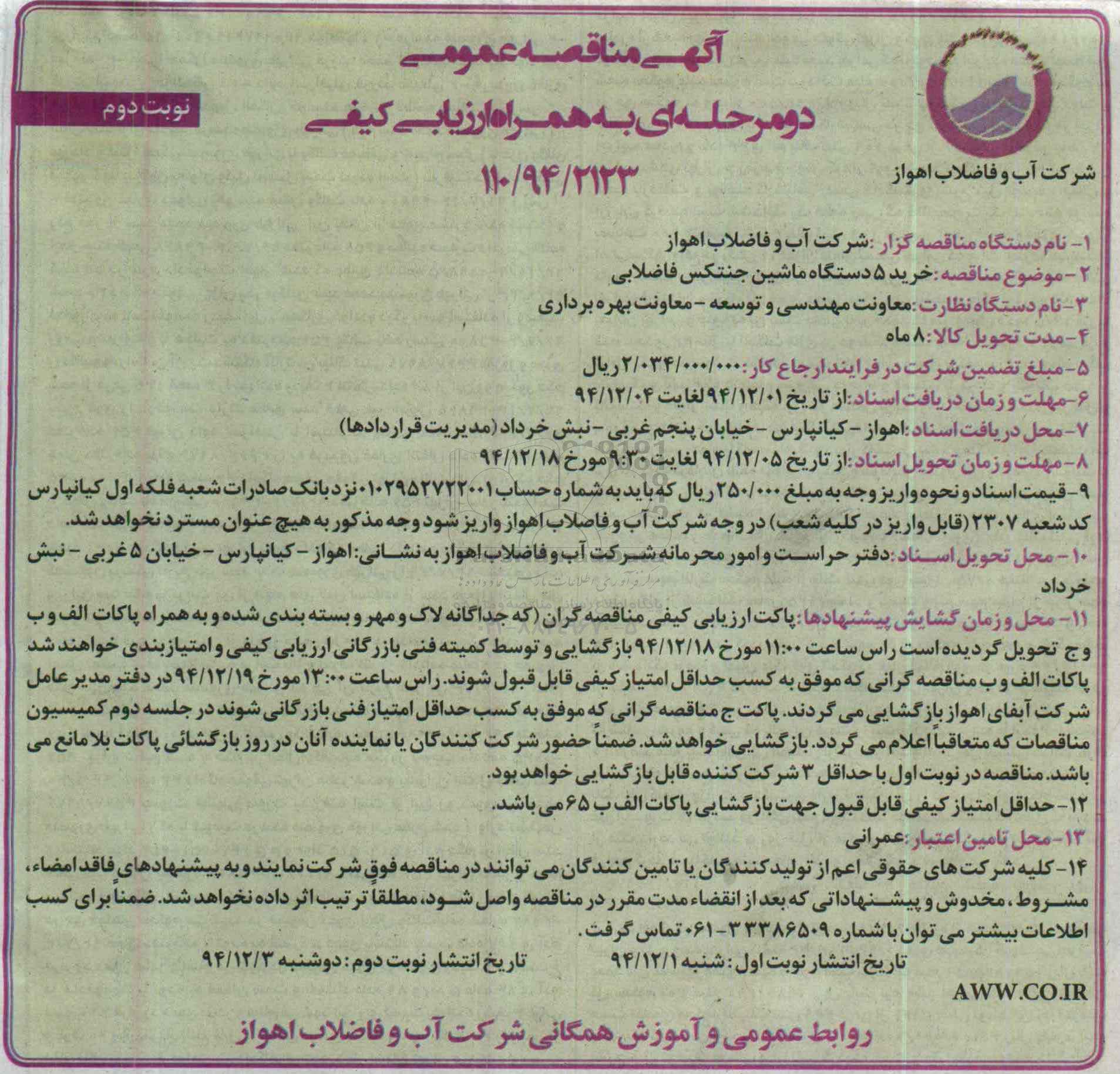 11. محل و زمان گشایش پیشنهادها: پاکت ارزیابی کیی مناقصه گران که جداگانه لاک و مهر و بسته بندی شده و به همراه پاکات الف و ب و ج تحویل گردیده است رأس ساعت 11 مورخ 94.12.18 بازگشایی و توسط کمیته فنی بازرگانی ارزیابی کیفی و امتیازبندی خواهند شد پاکات الف و ب مناقصه گرانی که موفق به کسب حداقل امتیاز کیفی قابل قبول شوند. راس ساعت 13 مورخ 94.12.19 در دفتر مدیر عامل شرکت ابفای اهواز بازگشایی می گردند. پاکت ج مناقصه گرانی که موفق به کسب حداقل امتیاز فنی بازرگانی شوند در جلسه دوم کمیسیون مناقصات که متعاقبا اعلام می گردد. بازگشایی خواهد شد. ضمناً حضور شرکت کنندگان یا نماینده آنان در روز بازگشایی پاکات بلامانع می باشد. مناقصه در نوبت اول با حداقل 3 شرکت کننده قابل بازگشایی خواهد بود.