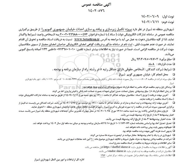 شهرداری منطقه ده شیراز در نظر دارد پروژه تکمیل زیرسازی و پیاده روسازی احداث خیابان جمهوری گویم را از طریق برگزاری مناقصه عمومی در سامانه تدارکات الکترونیکی دولت ستاد با شماره فراخوان 2002096688000472 به اشخاص واجد شرایط واگذار نماید. لذا از کلیه متقاضیان دعوت به عمل می آید با مراجعه به آدرس ستاد ایران نسبت به دریافت اسناد مناقصه و تحویل آن اقدام نمایند. در صورت عدم عضویت قبلی ثبت نام در سامانه مذکور و دریافت گواهی امضای الکترونیکی صاحبان امضای مجاز از سوی متقاضیان جهت شرکت در مناقصه الزامی است. ضمنا در صورت نیاز به اطلاعات بیشتر شماره تلفن 07136501010 داخلی 133 آماده پاسخگویی می باشد