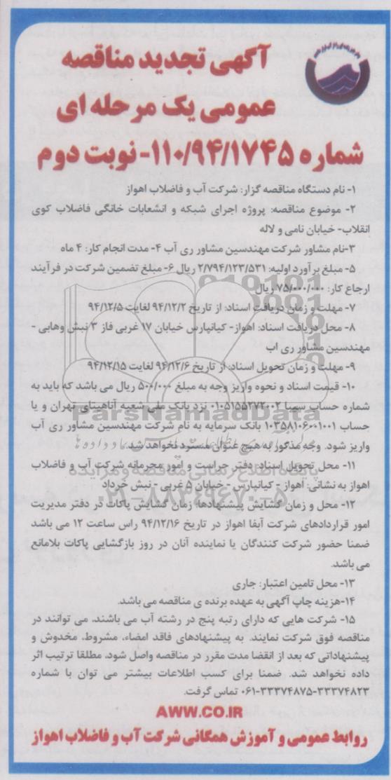 1- نام دستگاه مناقصه گزار: شرکت آب و فاضلاب اهواز