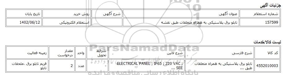 | 157599 | تابلو برق پلاستیکی به همراه متعلقات طبق نقشه | استعلام الکترونیکی | 1402/06/12 |