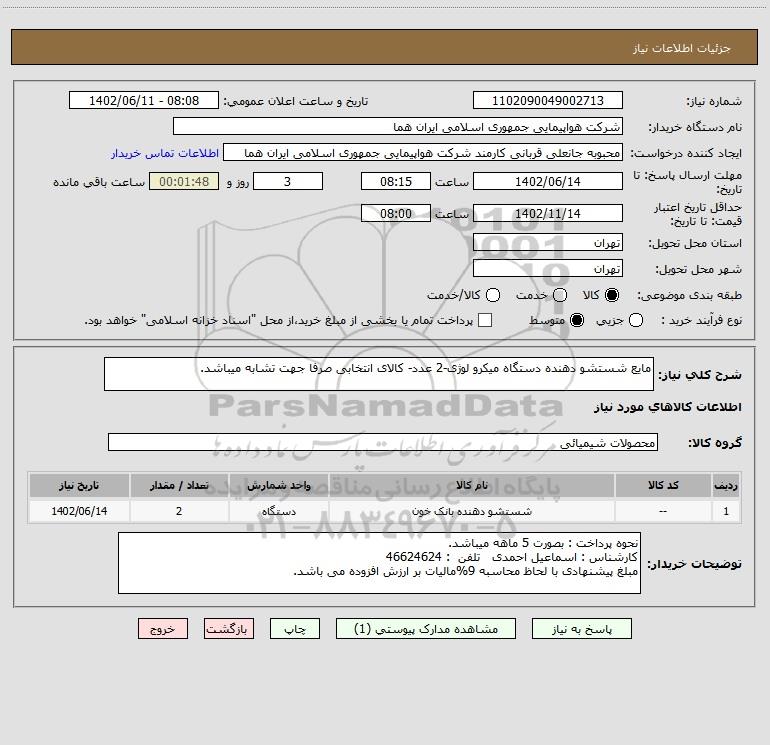 نام دستگاه خریدار:شرکت هواپیمایی جمهوری اسلامی ایران هما